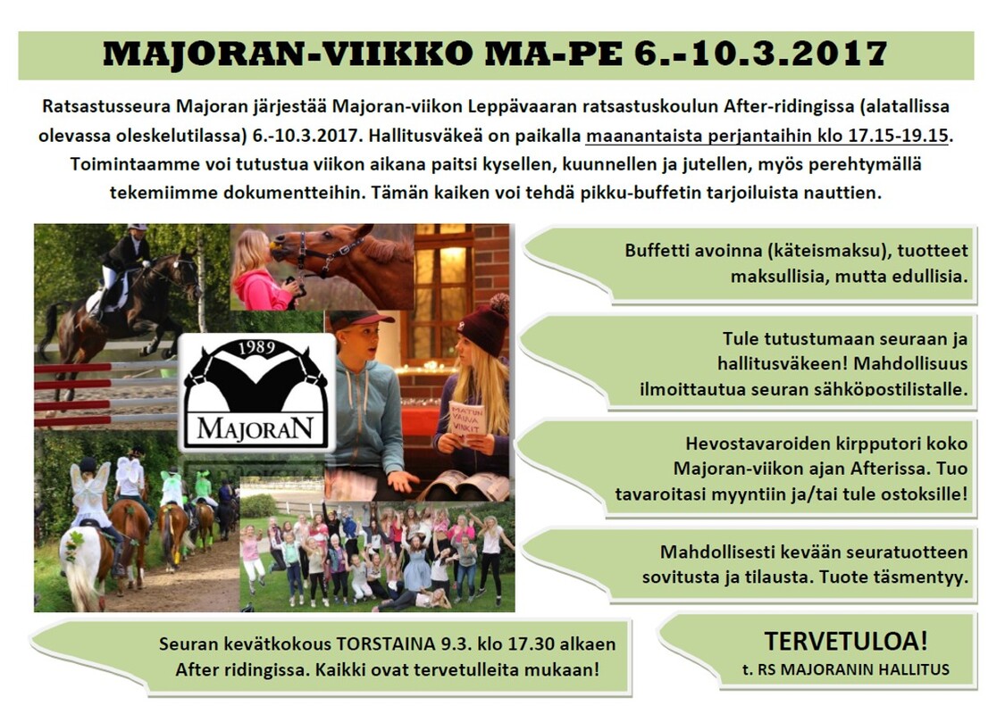 Kevyttoppatakin sovitusta, varustekirppis, buffetti, seuran kevätkokous torstaina, jne. Majoran-viikko ratsastuskoululla maanantaista perjantaihin 6.-10.3.2017Ratsastusseura Majoran järjestää Majoran-viikon Leppävaaran ratsastuskoulun After-ridingissa (alatallissa olevassa oleskelutilassa) 6.-10.3.2017. Hallitusväkeä on paikalla maanantaista perjantaihin klo 17.15-19.15. Toimintaamme voi tutustua viikon aikana paitsi kysellen, kuunnellen ja jutellen, myös perehtymällä tekemiimme dokumentteihin. Tämän kaiken voi tehdä pikku-buffetin tarjoiluista nauttien. OHJELMASSA ON: - Buffetti avoinna (käteismaksu), tuotteet maksullisia, mutta edullisia.- Kevään seuratuotteen, kevyttoppatakin, sovitusta ja tilausta.RS MAJORANIN KEVÄÄN 2017 SEURATUOTE, tilaa oma kevyttoppatakkisi! Merkki: Clique Hudson ladies. myös men & kids: Moderni kevyttoppatakki, jossa on tekountuvatoppaus. Irrotettava huppu, kolme vetoketjullista ulkotaskua ja kaksi sisätaskua. Lisäksi kauluksessa lenkki kuulokejohdolle. 40°C konepesu. Saatavana myös miesten ja lasten malli. Materiaali: Päällyskangas ja vuori: 100 % polyesteriä. Toppaus: untuvamaista 100 % polyesteriä. Koot: Naisten malli XS-XXL. Lapsille tarjolla lasten Cliquen Hudson Junior, koot 110/120 cm, 130/140 cm ja 150/160 cm. Miesten/unisex mallissa koot S-XXXL Värit: Tummansininen ja musta Painatus: Majoran-logo (leveys noin 9 cm) vasemmassa rinnuksessa Hinta: 68 € sisältää painatuksen. Huom! Tilauksen toteutumisen vähimmäismäärä on 20 kpl Maksun eräpäivä: HETI, kuitenkin viimeistään 15.3.2017. Tilille: Ratsastusseura Majoran /Nordea FI12 1013 3000 1313 49. Huom! Käytäthän viitenumeroa 1339! Toppatakkeja on mahdollisuus sovittaa tallilla ennen tilaamista Majoran-viikon aikana 6.-10.3. klo 17.15-19.15 After Riding-tilassa! Tilaus on sitova. Sovitusvaatteet palautetaan Majoran-viikon jälkeen. Jos et pääse sovittamaan takkia Majoran-viikon aikana ja haluat sen tehdä, otathan etukäteen yhteyttä hallituksen edustajiin, esim. Anu Helomaahan (puh. 040 592 2929, anu.helomaa@iki.fi). Kiitos! - Tule tutustumaan seuraan ja hallitusväkeen! Mahdollisuus ilmoittautua seuran sähköpostilistalle.- Hevostavaroiden kirpputori koko Majoran-viikon ajan Afterissa. Tuo tavaroitasi myyntiin ja/tai tule ostoksille!