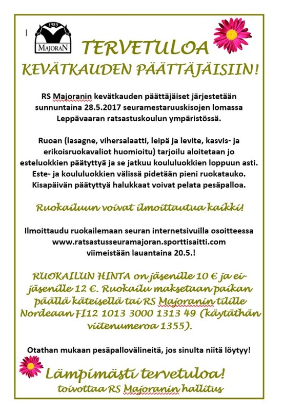 Päättäjäisiä vietetään seuramestaruuskisapäivän aikana sunnuntaina 28.5., ruokailu aloitetaan jo esteluokkien päätyttyä. TERVETULOA KEVÄTKAUDEN PÄÄTTÄJÄISIIN! RS Majoranin kevätkauden päättäjäiset järjestetään sunnuntaina 28.5.2017 seuramestaruuskisojen lomassa Leppävaaran ratsastuskoulun ympäristössä. Ruoan (lasagne, vihersalaatti, leipä ja levite, kasvis- ja erikoisruokavaliot huomioitu) tarjoilu aloitetaan jo esteluokkien päätyttyä ja se jatkuu koululuokkien loppuun asti. Este- ja koululuokkien välissä pidetään pieni ruokatauko. Kisapäivän päätyttyä halukkaat voivat pelata pesäpalloa. Ruokailuun voivat ilmoittautua kaikki! Ilmoittaudu ruokailemaan seuran internetsivuilla osoitteessa www.ratsastusseuramajoran.sporttisaitti.com viimeistään lauantaina 20.5.! Ilmoittautumislomakkeeseen pääset TÄÄLTÄ. RUOKAILUN HINTA on jäsenille 10 € ja ei-jäsenille 12 €. Ruokailu maksetaan paikan päällä käteisellä tai RS Majoranin tilille Nordeaan FI12 1013 3000 1313 49 (käytäthän viitenumeroa 1355). Otathan mukaan pesäpallovälineitä, jos sinulta niitä löytyy! Lämpimästi tervetuloa! toivottaa RS Majoranin hallitus Liitteet |
