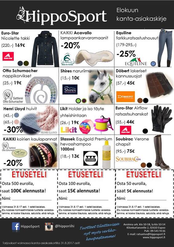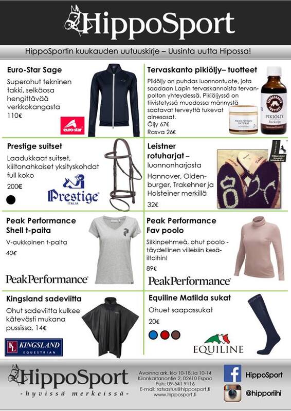 Kurkkaa tarjouksien lisäksi heinäkuun uutuudet! HippoSportin heinäkuun uutuuskirjeestä löytyy paljon ihania uutuuksia ja kanta-asiakastarjouksista teet edullisia ostoksia joko itsellesi tai hevoselle! Klikkaamalla vasemmalla olevia kuvia saat ne isommaksi. Tarjoussivut löydät myös päävalikon Yhteistyössä-linkin alta. |