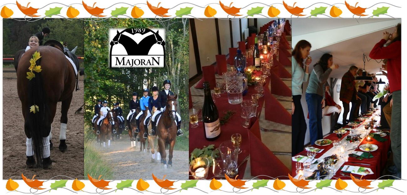 Ratsastuksen hinta 24 €, illallisen ja ruokajuoman hinta 25 €. Pelkän illallisen voi maksaa tilille tai paikan päällä käteisellä, ratsastus tulee maksaa paikan päällä käteisellä. Seuran tilinumero Nordeassa on FI12 1013 3000 1313 49, huom! viitenumeroksi 1290. Seuraavassa suunniteltu menu: * Kurpitsakeittoa ja ruohosipulimarcarponea (G), viher-kasvissalaattia ja vadelmavinaigretteä (L,G) ja leipää ja levitettä * Kokonaisena grillattua possun ulkofilettä, tummaa sienikastiketta ja juurescaponataa (L, G), VEGE koftapihvejä, yrtti-jugurttikastiketta ja juurescaponataa (L, G) * valkosuklaamoussea ja kanelilla maustettua puolukkalientä (G) Ratsastamaan ja syömään kutsutaan: Susanna Salmio, Eeva Tiainen, Jaana Nikkola, Katri Kairimo, Laura Ahlblad, Terhi Markula, Elina Avela, Sari Nurmi, Jenni Ek, Pinja Rantonen, Kira Stenman, Maiju Kaarsalo-Koskela, Markus Oedewald, Pia Oedewald, Maarit Seitsonen, hallituslaiset ja ratsastuksenopettajat. Syömään kutsutaan: Eva Nurminen, Sara Haanpää, Ida Inkinen, Hannele Mutikainen, Heikki Mutikainen, Tia Mutikainen, Elina Kouti-Halinen, Teemu Ahtee, Siv Englund, Johanna Virsunen, Camilla Fyhrqvist-Kokkonen, Annaleena Rauha ja Heidi Junkkarinen. Myös kaikki muut ovat sydämellisesti tervetulleita seuraamaan tapahtumaa! Ilmoittautumiset viimeistään torstaina 20.9. sähköisellä ilmoittautumislomakkeella (TÄÄLTÄ). Kuulisimme osallistujilta mieluusti ehdotuksia ohjelmasta, leikeistä, tms. seurustelun ohessa. Ohjelmaa voi esittää itse tai antaa idean hallituslaisille, ennakkoon tai paikan päällä. Syksyisin terveisin, RS Majoranin hallitus PS. Hubertuksiin kutsutaan edellisen vuoden aikana Majoranin tapahtumissa (kisat ja muut tapahtumat) eniten talkoopisteitä keränneet. Tallilla käy paljon muutenkin ahkeraa väkeä, mutta kaikille ei ole vaan kertynyt talkoopisteitä. Juhlatila asettaa rajoitteita kutsuttavien määrään. Kiitos KAIKILLE ahkerille! Liitteet