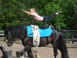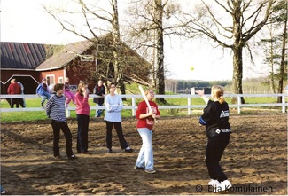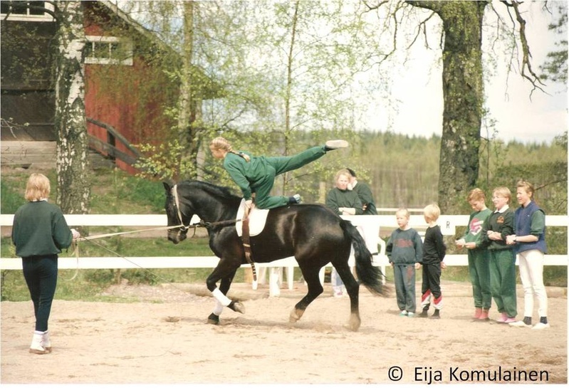 OSA 3: Vasemmalla vikellysnäytöksessä keväällä 1991 poni Jackpot. Juoksuttajana Jonna Vepsä, selässä Martina Rydman. Rivissä Kati Ahtee (vas.), Tapio, Sanni Hyvönen, Piia Ahtee ja Paola Rydman. (© Eija Komulainen). Oikealla AG-tallin Mandy-heppa vikellysdemossa Leppävaarassa v. 2013, kyydissä Milla Himberg (© Maiju Kaarsalo-Koskela).